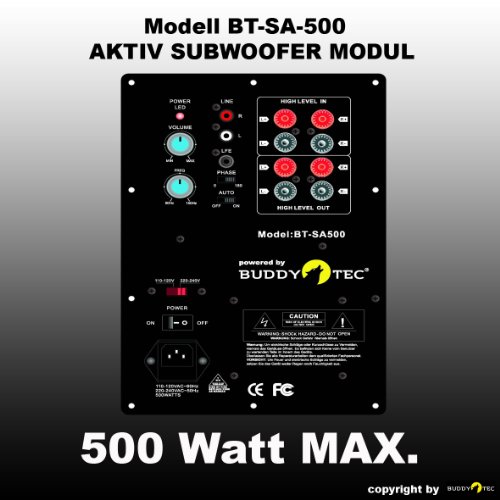 AKTIV SUBWOOFER MODUL500 WATT MAX.Mit diesem Modul machen Sie in wenigen Minuten ausIhrem passivem Subwoofer einen Aktiv-SubwooferModell BT-SA 500Dieses aktive Subwoofer-Modul filtert die Bassfrequenzen aus dem Eingangssignal,verstärkt sie undgibt sie dann über den angeschlossenen Subwoofer Lautsprecher wieder.Das Modul kann mit einem Vorverstärkersignal über die eingebauten Cinchbuchsen oder überdie Lautsprechereingänge direkt von einem Vorverstärkerausgang angesteuert werden.Wird das Modul über die Lautsprechereingänge angesteuert,so liegt an den Lautsprecherausgängen ein Signal an,dessen Bassanteile ausgefiltert wurden.Dies hat den Vorteil,dass Satellitenlautsprecher ohne weitere Hochpass-Frequenzweiche angeschlossen werden können.Das Modul besitzt eine Einschaltautomatik,d.h. es schaltet sich automatisch ein,wenn ein Signal an denCinchbuchsen oder den Lautsprechereingängen anliegt.Zum Schutz des Moduls ist eine Schutzschaltung integriert,die das Modul bei Kurzschlussam Ausgang oder Überhitzung abschaltet.Die Lautstärke und die Tonfrequenz des Subwoofer-Moduls sind regelbar. *Musikausgangsleistung 500W Max/4Ohm * Sinusausgangsleistung 250W RMS/4Ohm * Frequenz stufenlos regelbar 50 - 150Hz bei 12dB * Phaseregler 0-180° * LED Betriebsanzeige * Betriebsart wählbar Off/On/Auto * Ein-/Ausschalter * Cincheingänge (bevorzugte Verbindung) * Lautsprechereingang High Level In * Lautsprecherausgang High Level Out * LFE Anschlussbuchse * Netzspannung wählbar 110-120V/60Hz oder 220-240V/50Kz * Abmessungen ( T x B x H in mm): 95 x 180 x 270 * Erforderlicher Boxenausschnitt : 155 x 245 mm * Einbautiefe: 90 mm * Gewicht : ca 3,8 kg * Lieferung komplett mit Stromanschlusskabel